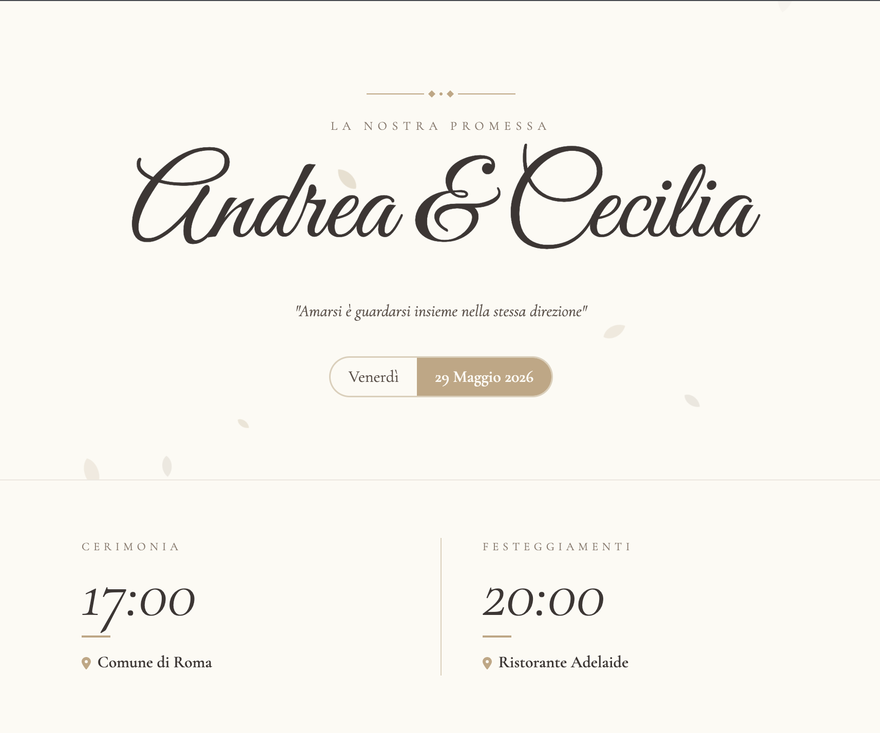 Inviti digitali con maps integrato e RSVP tramite WhatsApp: i vostri ospiti potranno raggiungere la location con un tap e confermare la presenza direttamente.